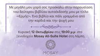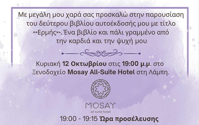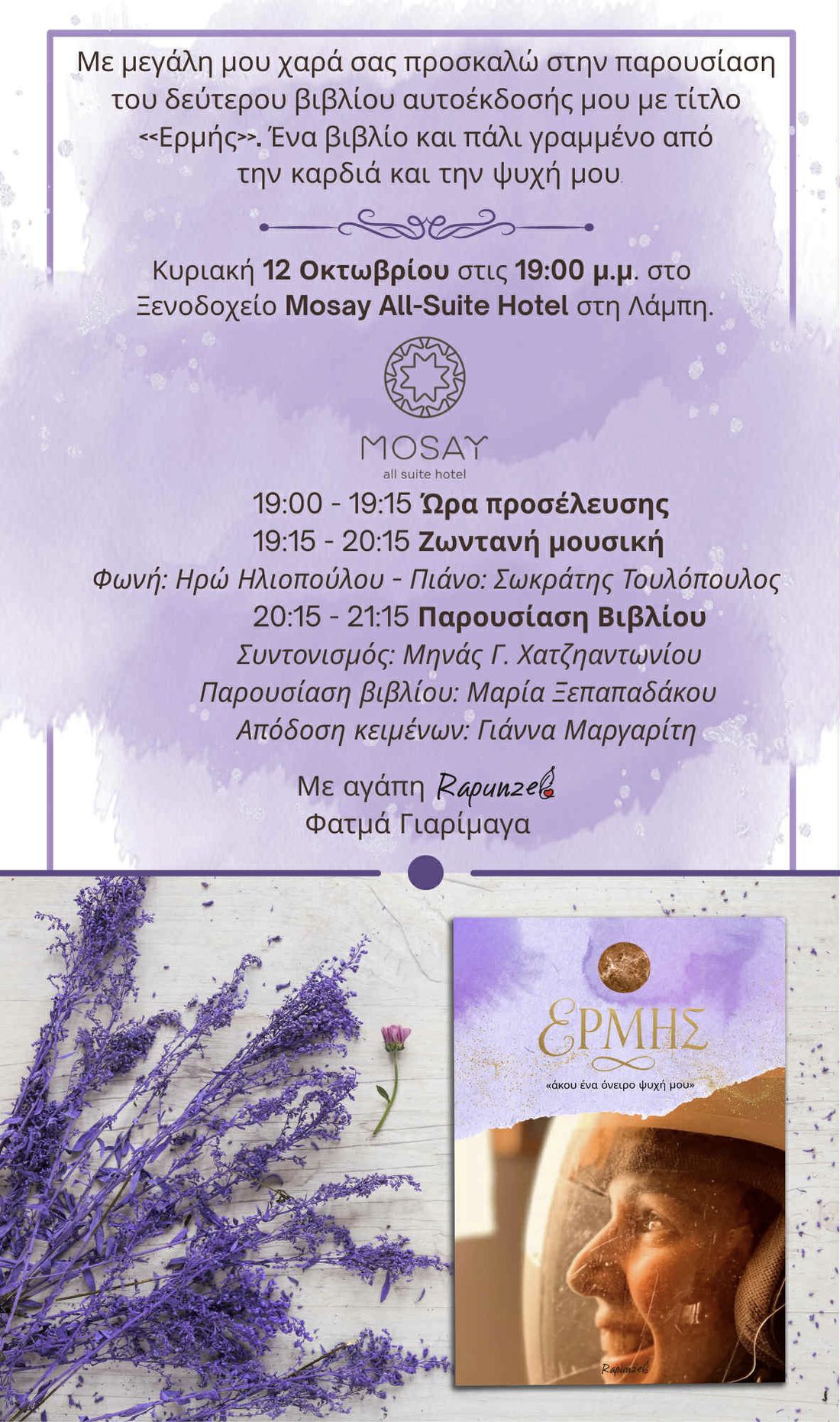 Ένα νέο ταλαντούχο κορίτσι της Κω, η αγαπητή Φατμά Γιαρίμαγα που είναι γεμάτη καλλιτεχνικές ευαισθησίες και ανησυχίες, μίλησε στο Βήμα της Κω και Ράδιο Πρώτο για το νέο της βιβλίο.«Ερμής» είναι ο τίτλος της δεύτερης συγγραφικής της προσπάθειας. Ένα βιβλίο γεμάτο προσωπική έμπνευση, ποιήματα και μοναδικές στιγμές. Μίλησε και για το τραγούδι με το οποίο ασχολείται επαγγελματικά τα τελευταία χρόνια, την ζωγραφική, τον αθλητισμό και τα ταξίδια της.Άλλωστε η ζωή είναι ένα ταξίδι που γεμίζει με καθημερινές εμπειρίες.Η εκδήλωση θα πραγματοποιηθεί την Κυριακή 12 Οκτωβρίου στις 19:00 μ.μ., στο Mosay All-Suite Hotel στη Λάμπη.Η βραδιά θα ξεκινήσει με ζωντανή μουσική από την Ηρώ Ηλιοπούλου (φωνή) και τον Σωκράτη Τουλόπουλο (πιάνο), ενώ στη συνέχεια θα γίνει η επίσημη παρουσίαση του βιβλίου.Τον συντονισμό της εκδήλωσης θα έχει ο Μηνάς Γ. Χατζηντωνίου, η παρουσίαση του βιβλίου θα γίνει από τη Μαρία Ξεπαπαδάκου, ενώ αποσπάσματα θα αποδώσει η Γιάννα Μαργαρίτη.Η συγγραφέας καλεί όλους όσοι αγαπούν τη λογοτεχνία και τα ειλικρινή μηνύματα ψυχής να παρευρεθούν σε μια όμορφη και συγκινητική βραδιά. Ημερομηνία: Κυριακή 12 Οκτωβρίου Ώρα έναρξης: 19:00 μ.μ. Τοποθεσία: Mosay All-Suite Hotel, Λάμπη.