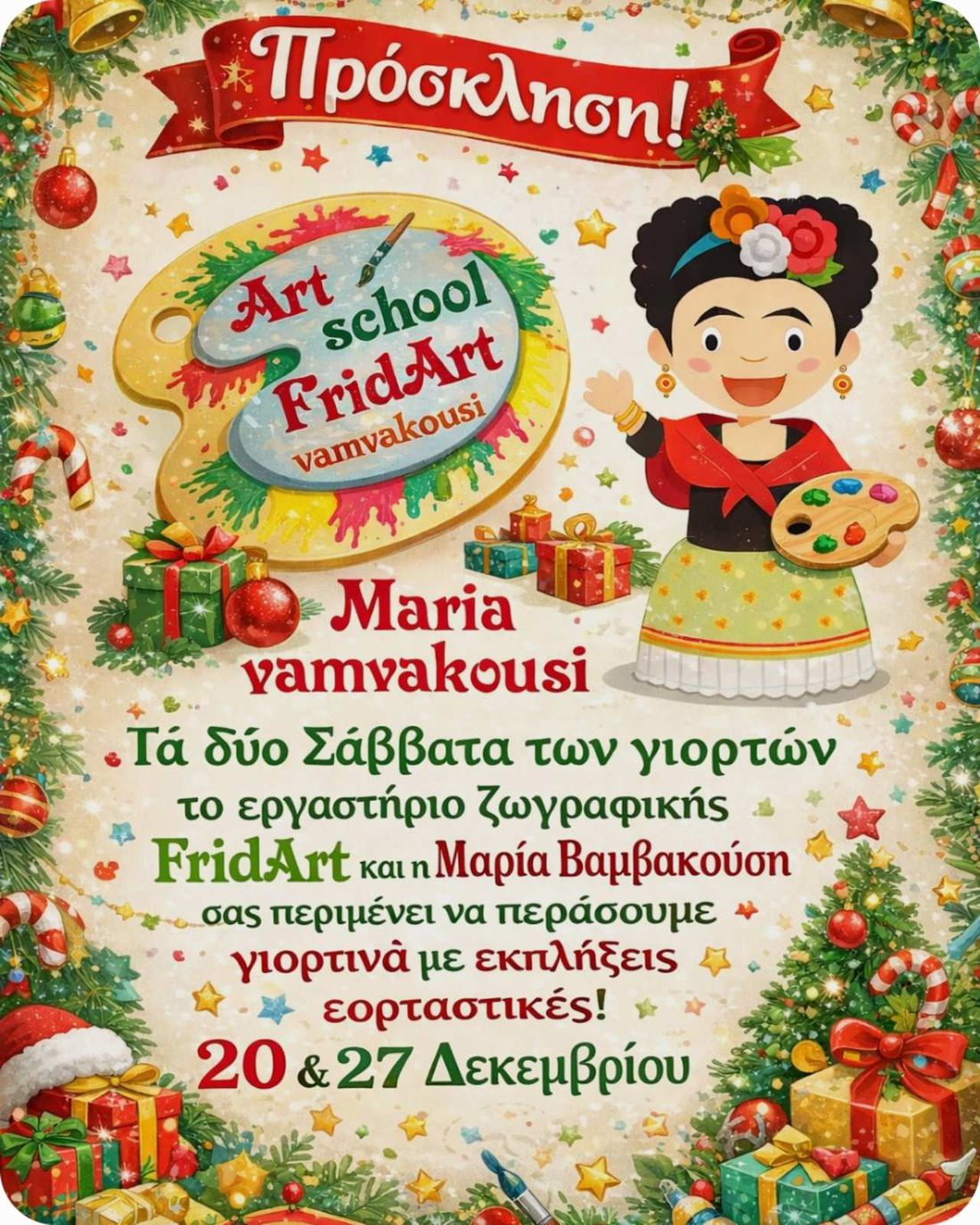 Το εργαστήριο ζωγραφικής FridArt της Μαρίας Βαμβακούση σας προσκαλεί σε μια μικρή, ξεχωριστή γιορτή γεμάτη χρώματα, χαμόγελα και μαγικές στιγμές με τα παιδιά.