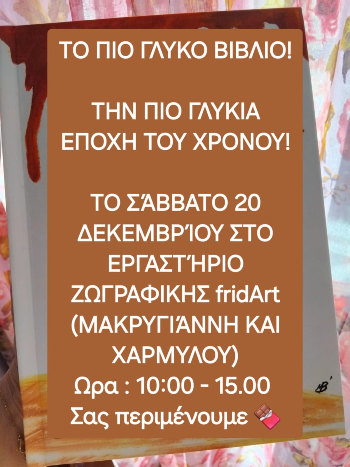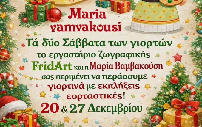 Τα Σάββατα 20 & 27 Δεκεμβρίου, οι μικροί καλλιτέχνες θα ζήσουν όμορφες δημιουργικές εμπειρίες, θα παίξουν, θα ζωγραφίζουν και θα απολαύσουν πολλές γιορτινές εκπλήξεις, σε ένα ζεστό και χαρούμενο περιβάλλον. Στο πλαίσιο της γιορτής, θα παρουσιαστεί και το πιο γλυκό βιβλίο της πιο γλυκιάς εποχής του χρόνου, της Μικελίνας Γιαουρδήμου, με γλυκιές συνταγές, αρώματα Χριστουγέννων και αγάπη.