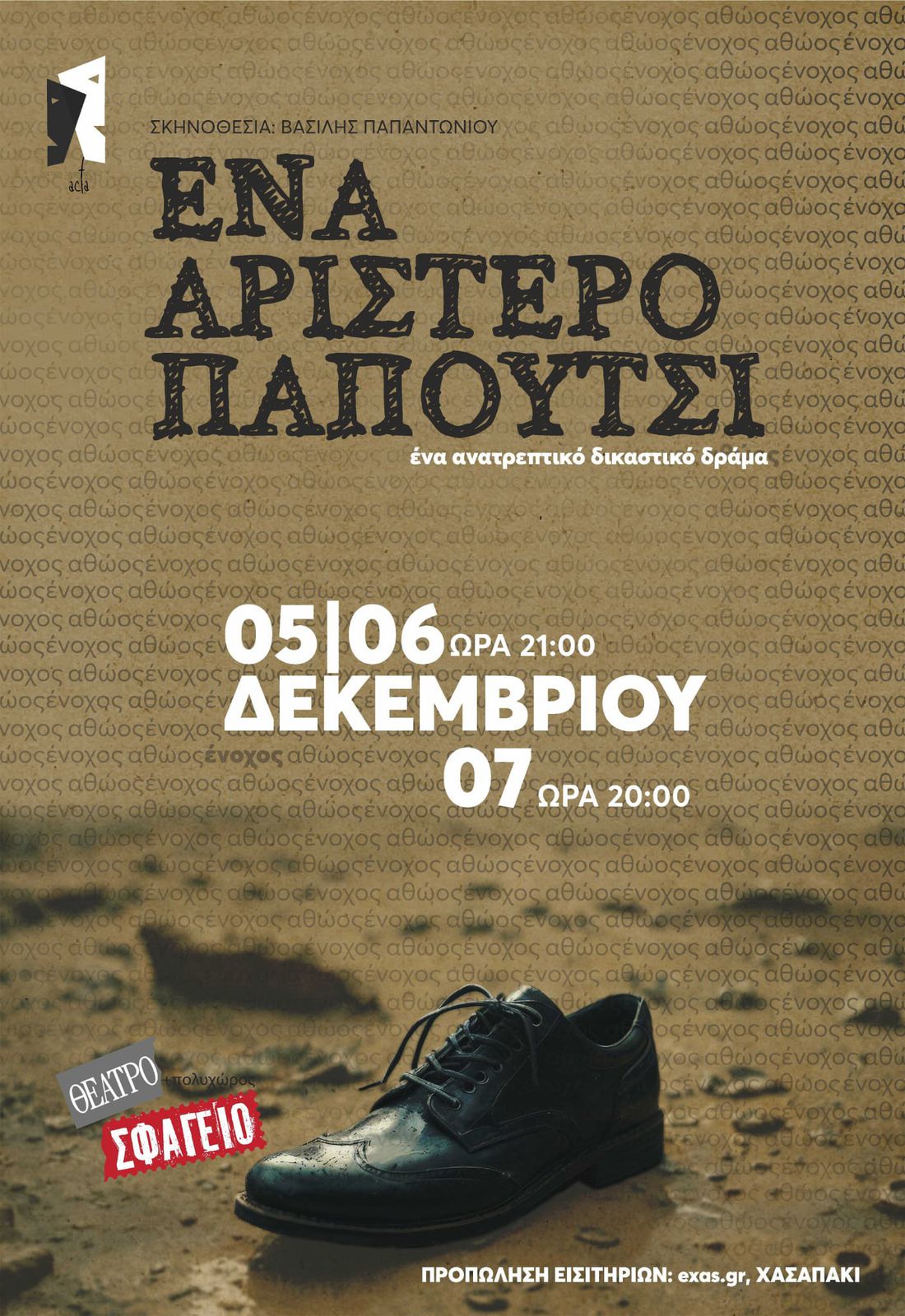 Η θεατρική παράσταση "Ένα αριστερό παπούτσι", ανεβαίνει στο Θέατρο Σφαγείο 5-7 Δεκεμβρίου
