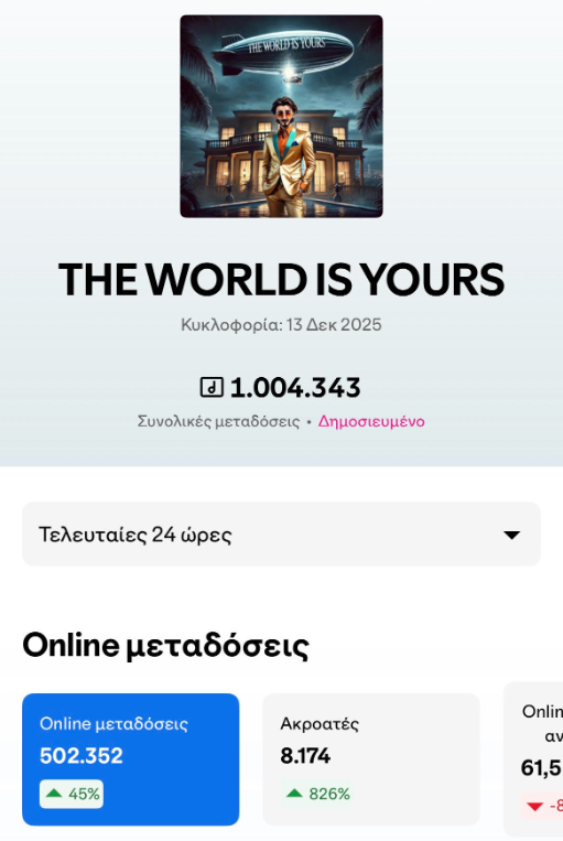 Το νέο του άλμπουμ «The World Is Yours», που κυκλοφόρησε στις 13 Δεκεμβρίου 2025, σημείωσε εντυπωσιακή επιτυχία, αγγίζοντας το 1.000.000 streams στο Spotify μέσα σε μόλις μία εβδομάδα, συγκέντρωσε αυτόν τον ασυναγώνιστο αριθμό προβολών και γράφοντας ένα ακόμα σημαντικό κεφάλαιο στη σύγχρονη trap μουσική.