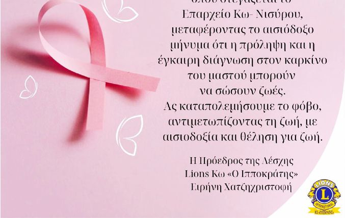 Η Λέσχη μας Lions Κω "Ο ΙΠΠΟΚΡΑΤΗΣ" συμμετέχει για 6η χρονιά στις εκδηλώσεις ευαισθητοποίησης για τον Καρκίνο του Μαστού και φωταγωγεί το Σάββατο 11 Οκτωβρίου, στις 19:30, το κτίριο του Επαρχείου με ροζ χρώμα, το χρώμα σύμβολο στον αγώνα ενάντια στη νόσο, με σκοπό να διαδώσουμε όλοι μαζί το μήνυμα της εκστρατείας για τον Καρκίνο του Μαστού, που δεν είναι άλλο από αυτό της πρόληψης και της έγκαιρης διάγνωσης που σώζει ζωές!