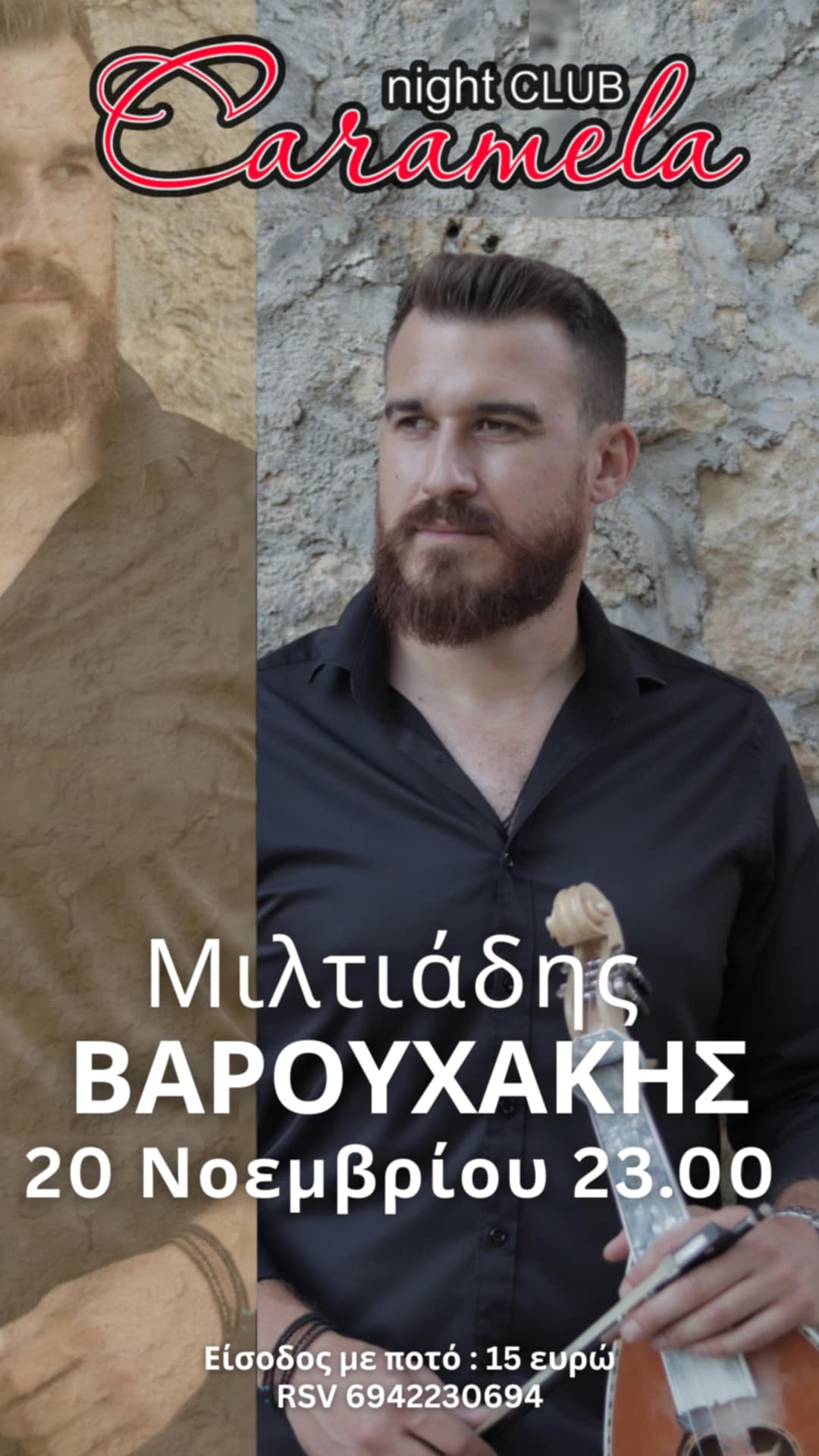 Την Τετάρτη 20 Νοεμβρίου, στις 23:00, ο Μιλτιάδης Βαρουχάκης ανεβαίνει στη σκηνή του night club Caramela στην Κέφαλο, για μια βραδιά γεμάτη κρητικό πάθος, μελωδίες και διασκέδαση μέχρι το πρωί!