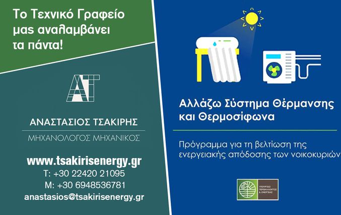 Το Τεχνικό μας γραφείο είναι πιστοποιημένο από το Υπουργείο Περιβάλλοντος & Ενέργειας για τη συμμετοχή στο νέο πρόγραμμα «Αλλάζω Σύστημα Θέρμανσης και Θερμοσίφωνα» και προσφέρει ολοκληρωμένες υπηρεσίες από την αίτηση μέχρι την τελική εγκατάσταση.