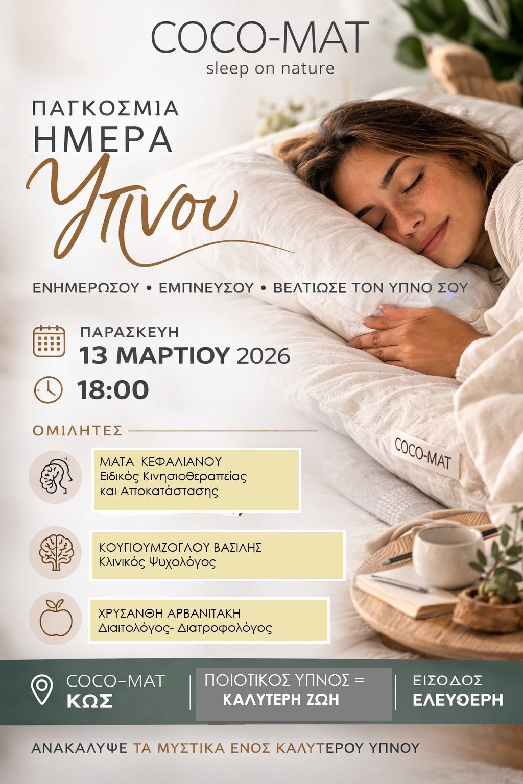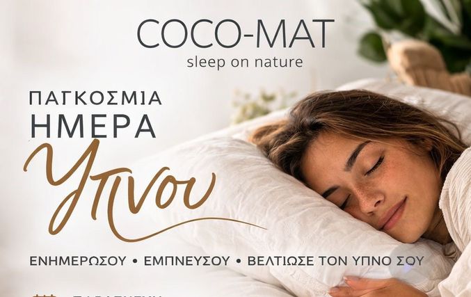 Με αφορμή την Παγκόσμια Ημέρα Ύπνου, το κατάστημα COCO-MAT Κω διοργανώνει μια ξεχωριστή ενημερωτική ημερίδα αφιερωμένη στη σημασία του ποιοτικού και φυσικού ύπνου.