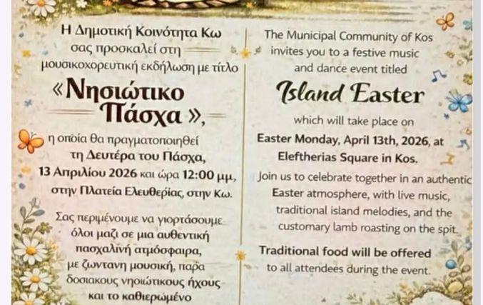 Μία μοναδική πασχαλινή εκδήλωση για επισκέπτες και κατοίκους της Κω διοργανώνει η κοινότητα της πόλεως Κω με τη συνδρομή χορηγών και εθελοντών. Ο Πρόεδρος της Κοινότητας, Σάκης Χατζηπετρός, διοργανώνει  ένα αυθεντικό πασχαλινό αντάμωμα την Δευτέρα της Λαμπρής για να γνωρίσουν τα έθιμα του τόπου οι τουρίστες και να διασκεδάσουν οι κάτοικοι.