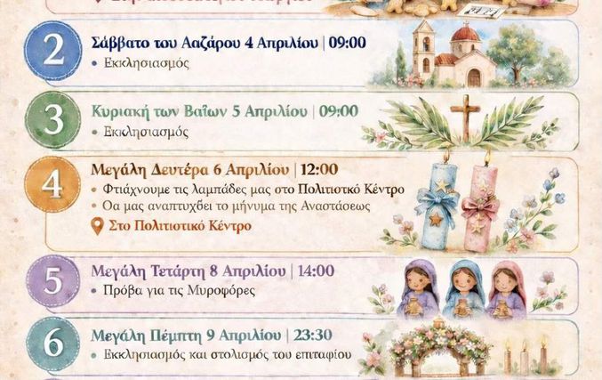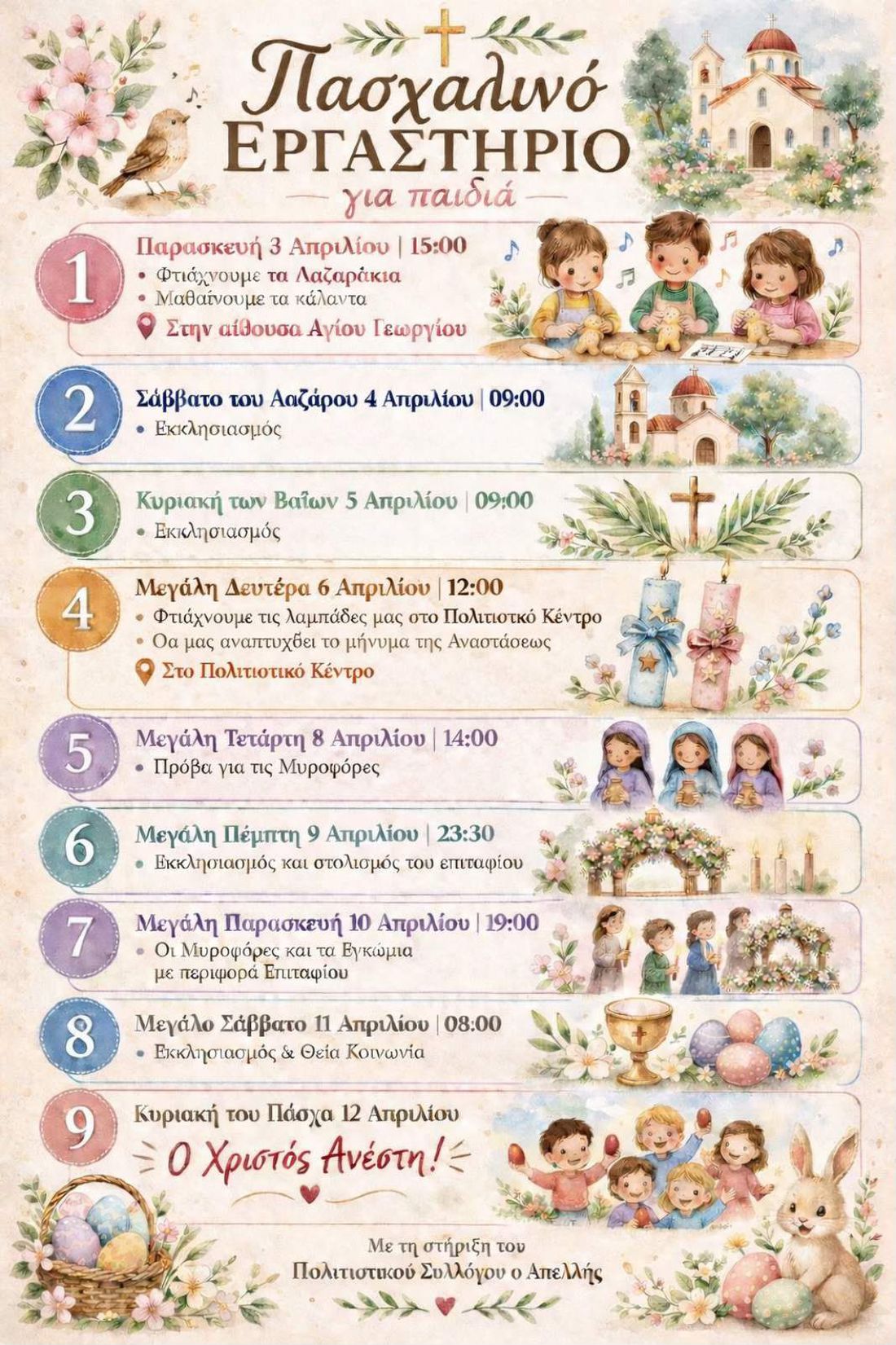 Οι δράσεις θα πραγματοποιηθούν από την Παρασκευή 3 Απριλίου έως και την Κυριακή του Πάσχα και δίνουν στα παιδιά τη δυνατότητα να γνωρίσουν από κοντά τα πασχαλινά έθιμα, να δημιουργήσουν, να συμμετέχουν ενεργά και να βιώσουν το πνεύμα των ημερών με χαρά και ενθουσιασμό.