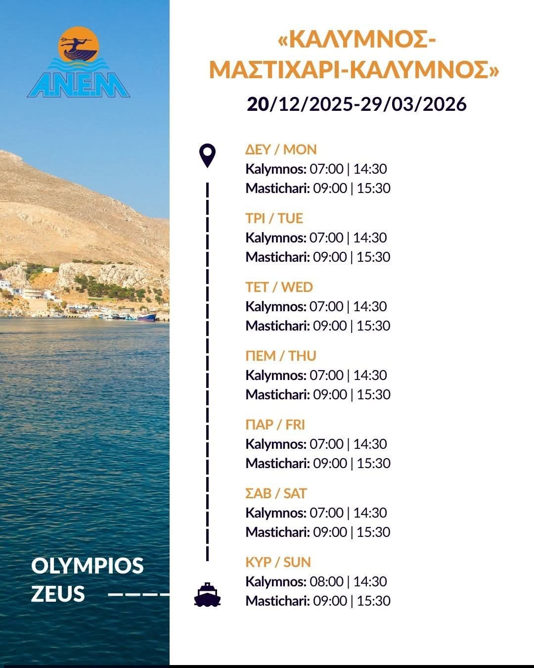Από την ΑΝΕ Μαστιχαρίου ανακοινώθηκαν τα δρομολόγια του “ΟΛΥΜΠΙΟΣ ΖΕΥΣ” μέχρι 29 Μαρτίου 2026