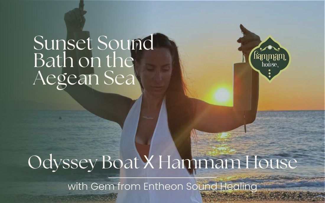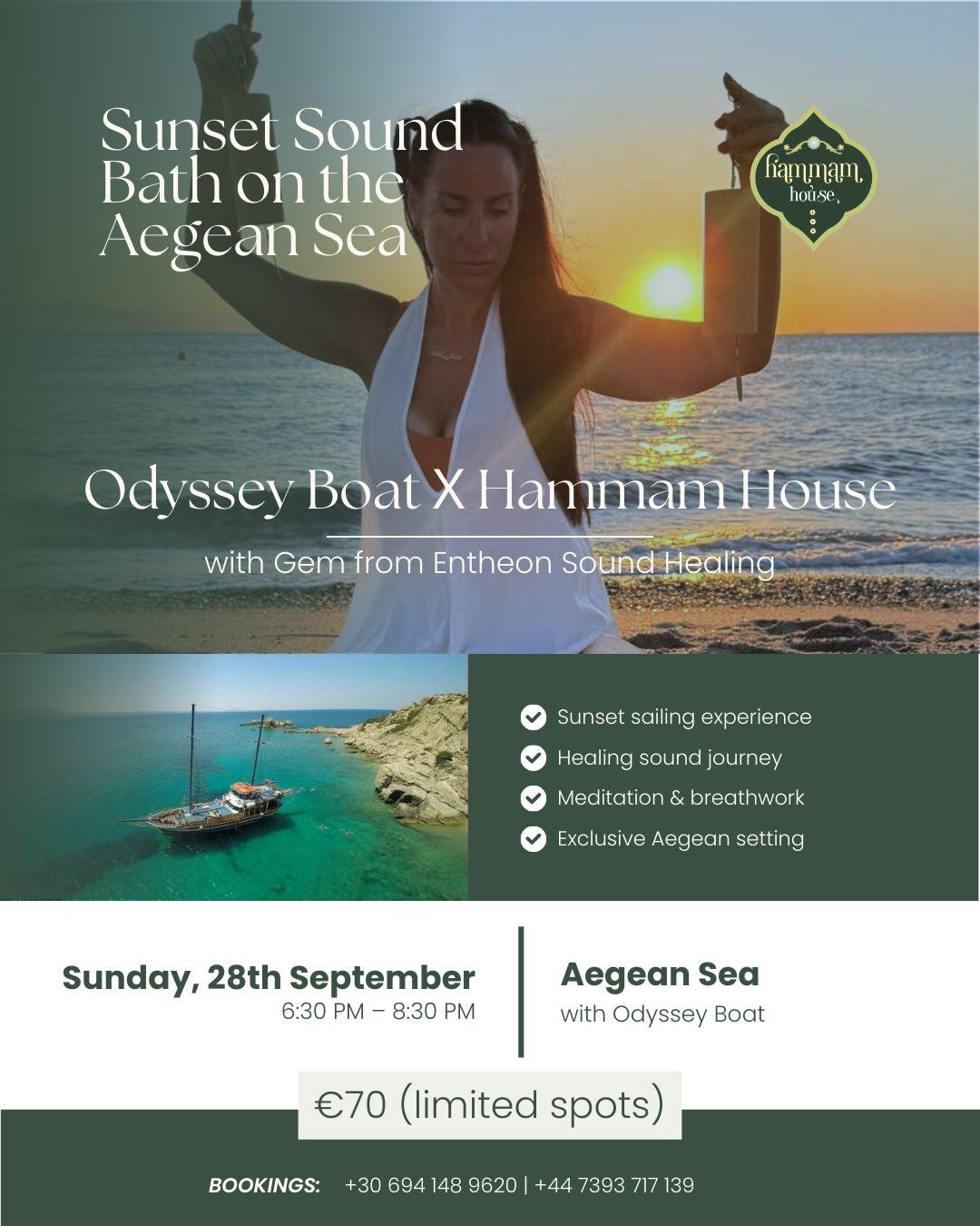 Odyssey boat and Hammam House with gorgeous Gem from Entheon Sound Healing, are organizing a healing sunset sail away in the middle of the Aegean ocean on Sunday 28th of September. If you want to join us book on time your ticket and you will find us at the ship at 18:30!