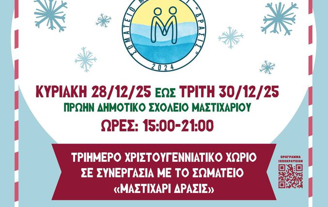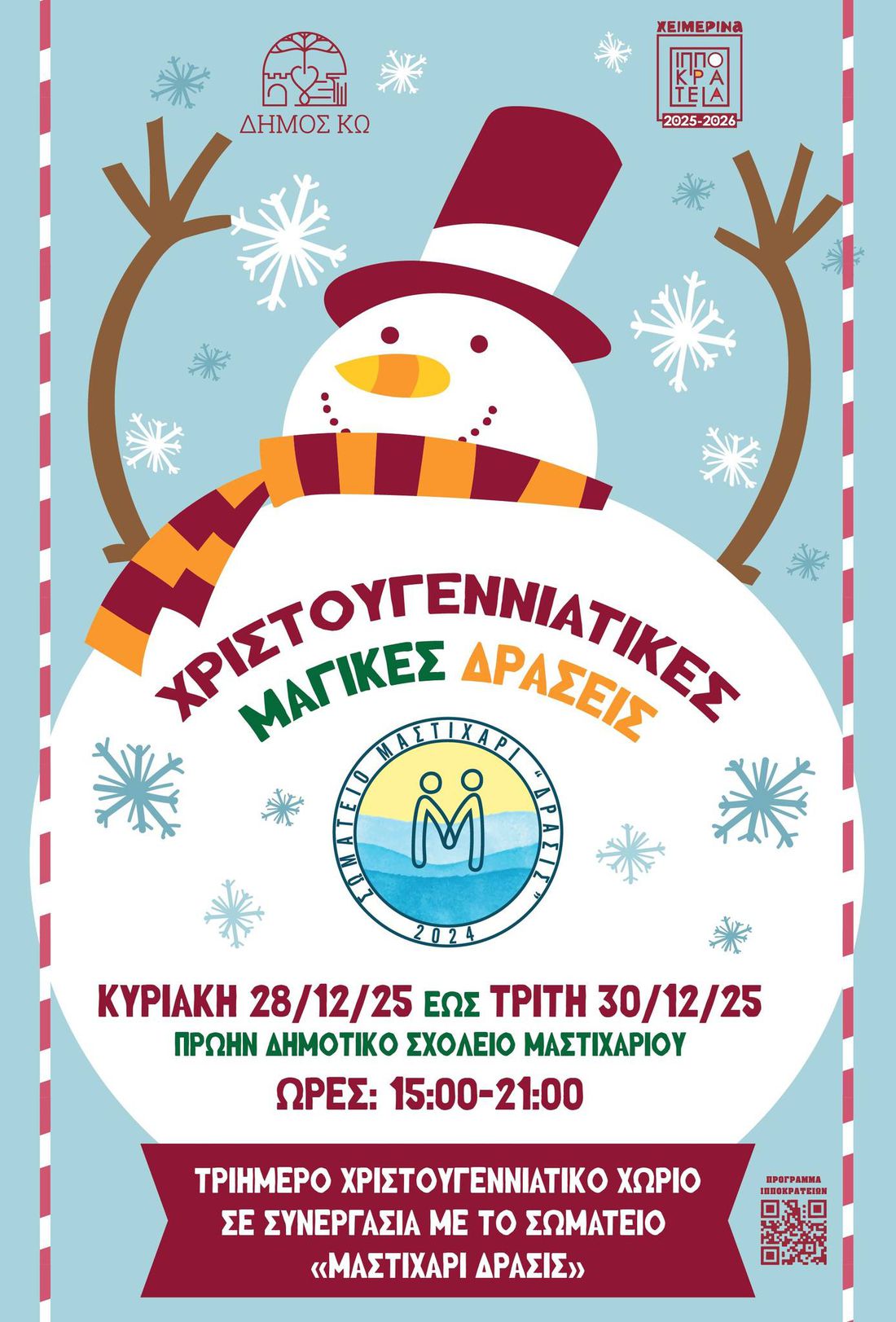 ΧΡΙΣΤΟΥΓΕΝΝΙΑΤΙΚΕΣ ΜΑΓΙΚΕΣ ΔΡΑΣΕΙΣ-ΤΡΙΗΜΕΡΟ ΧΡΙΣΤΟΥΓΕΝΝΙΑΤΙΚΟ ΧΩΡΙΟ σε συνεργασία με το ΣΩΜΑΤΕΙΟ «ΜΑΣΤΙΧΑΡΙ ΔΡΑΣΙΣ» ΠΡΩΗΝ ΔΗΜΟΤΙΚΟ ΣΧΟΛΕΙΟ ΜΑΣΤΙΧΑΡΙΟΥ, ΩΡΕΣ: 15:00-21:00 Τριήμερο με μουσικές εκδηλώσεις, δράσεις για παιδιά και άλλα πολλά. Τα χριστουγεννιάτικα σπιτάκια και ένα φουσκωτό Κάστρο περιμένουν στην αυλή του πρώην Δημοτικού Σχολείου Μαστιχαρίου μικρούς και μεγάλους. Στα Σπιτάκια θα βρείτε παραδοσιακά γλυκά, ποτά και εδέσματα, Χριστουγεννιάτικες κατασκευές κ.ά.