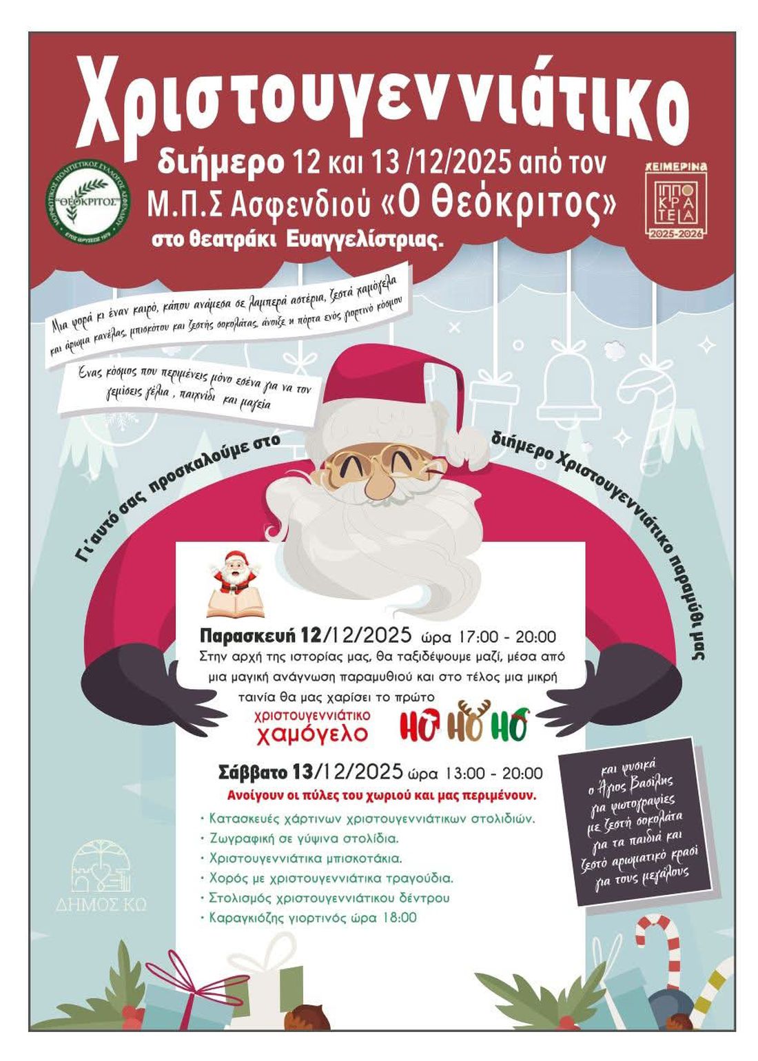 Ο Μ.Π.Σ. Ασφενδιού «Ο Θεόκριτος» διοργανώνει ένα ξεχωριστό διήμερο χριστουγεννιάτικο παραμύθι στο θεατράκι της Ευαγγελίστριας, γεμάτο φως, δημιουργία, μουσική και μαγεία για μικρούς και μεγάλους.